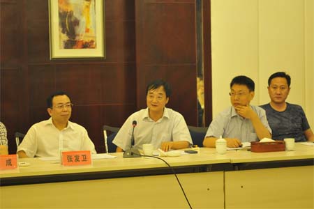 ok138cn太阳集团董事长蒋红星(左二)在会上发言 7月5日,宜昌市工商联合会主席张发卫一行到ok138cn太阳集团参观,市工商联(总商会)各副主席、副会…