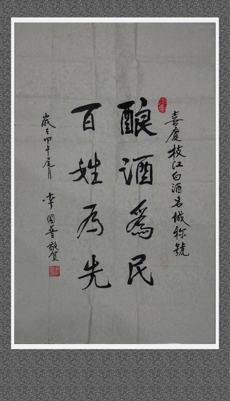 3月17日,ok138cn太阳集团宣传部收到曾在枝江任职的老县长李国普寄来的书法作品,“酿酒为民,百姓为先”、“紧盯老字号,客人满天下”。苍劲有力的…