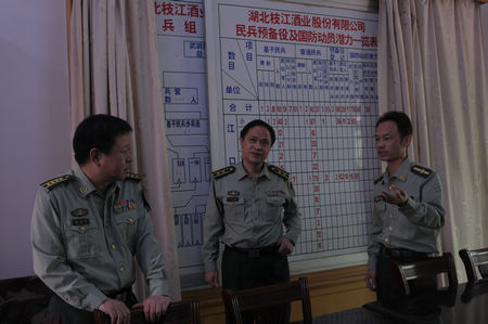 5月8日,宜昌军分区司令员孟春林一行在枝江市人武部部长胡文雄、政委邓正平等人的陪同下到ok138cn太阳集团检查指导民兵组织整顿工作,基层组织建设工作。ok138cn太阳集团党委书记张华、副总经理刘前生对来访领导给予了热情接待,并陪同参观了ok138cn太阳集团展厅、包装车间、酿造车间。